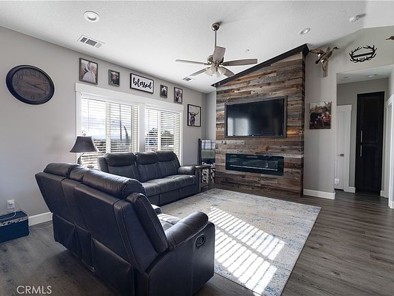Step inside to discover vaulted ceilings in the main living areas and 9-foot ceilings in the bedrooms and bathrooms, creating a bright and open atmosphere. The living room is a true showpiece, featuring a custom floor-to-ceiling hearth with an electric fireplace and a built-in TV alcove, blending warmth and sophistication.