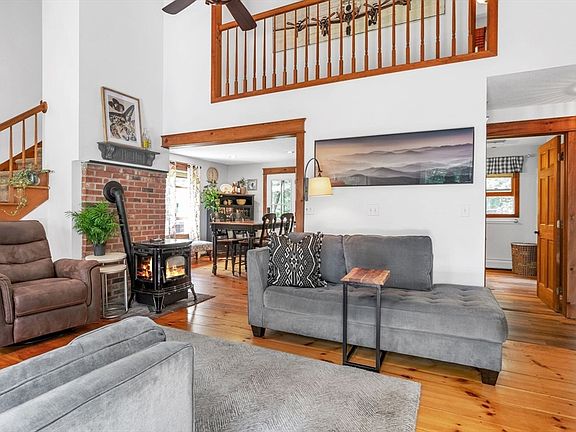 This lovely home is NOT your typical Cape! The extra wide front entrance is impressive with trex flooring and upgraded Board & Batten siding. Living room with vaulted ceiling, balcony, & brick hearth with flue for future wood stove. Beautiful wide pine flooring that continues into adjoining kitchen with stainless appliances, upgraded countertops, & tiled backsplash. Kitchen opens to back deck with screened pavilion that overlooks fenced back yard. First floor bath with shower & vanity, laundry area, & waterproof laminate flooring that continues through first floor bedrooms. Spacious Master with built in desk and double closet. Upstairs features 2 bedrooms with one being another potential spacious Master with sitting area, boot closet & more! Second floor bath with tub/shower. Many closets throughout this pristine home! 2 car under oversized Garage with work area. HIGHEST AND BEST OFFERS DUE BY MONDAY 8/19/24 AT NOON..