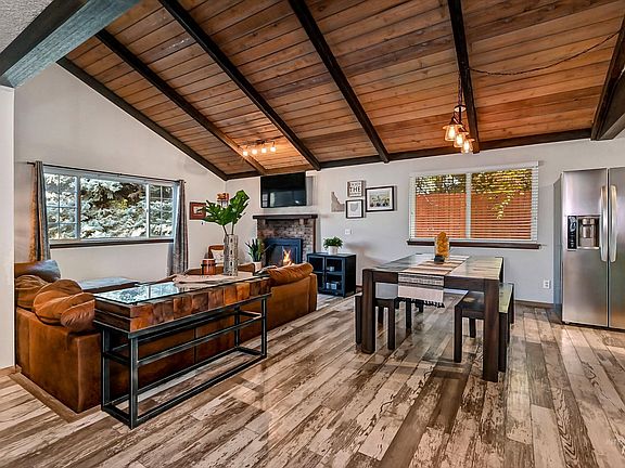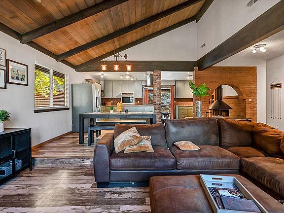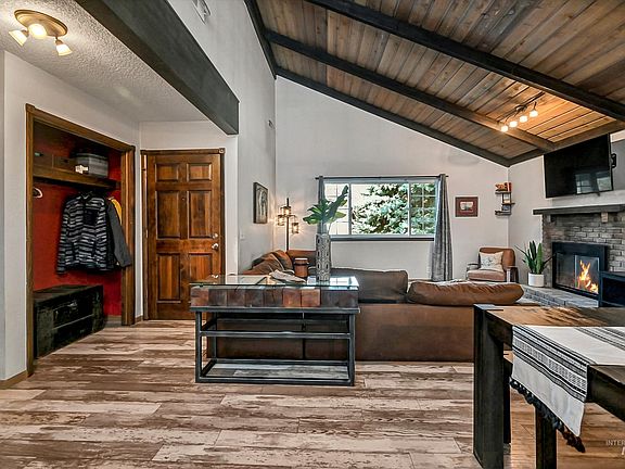 Tucked in a cul-de-sac, this single-story home is filled with modern-day rustic charm, yet pays tribute to the original character of the home; featuring 3 bedrooms, 2 baths, and over 1,400 square feet! Located in a tree-lined established neighborhood and only moments away from Downtown Eagle, bringing you the small-town feel without sacrificing urban amenities. Upon arrival, you will find the exterior features charming with a large covered entryway and porch for relaxing on warm summer evenings. Step inside to open concept living with expansive ceilings, graced with original beams and wood paneling. The living space features laminate flooring, a brick fireplace, and a carousel-style wood stove, leading you into a chef's kitchen. With stainless steel appliances, double ovens, an expansive butcher block island, a large vent hood, and gas cooktop, this kitchen is sure to bring your entertaining dreams to life. In the rear yard, a covered patio, garden box, and large trees abound.