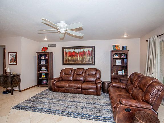 2 car oversize garage used as man cave, alley access with large metal sliding gate, double gates front/side parking, & 2 carport. Beautifully updated home with tile throughout (carpet in bedrooms), quality wood door & cabinetry, indoor laundry room with access to huge covered patio & green back yard. Front yard low maintenance desert landscaping. Stainless gas range, microwave, dishwasher, and large breakfast bar. Family room with doors to carport. Textured ceilngs, can lights. Well maintained home, nice!