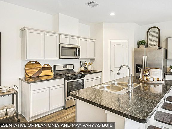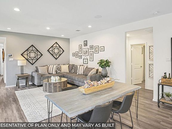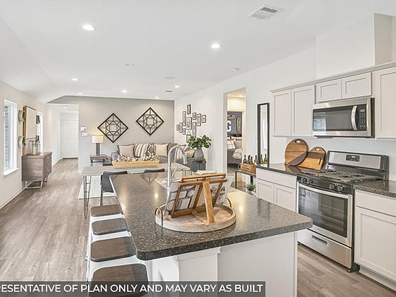 Beautiful 3-bed, 2-bath, 2-car garage home offering 1,539 sq. ft. of open-concept living. The kitchen, family room, and dining area flow seamlessly together, creating a bright and inviting space perfect for everyday living and entertaining. The kitchen features stunning 42” Polar White shaker cabinets, a crisp white subway tile backsplash, a spacious island, and a generous pantry—ideal for the chef in you. The primary suite is privately located at the rear of the home and includes a large walk-in closet and a roomy ensuite bathroom. The popular floor plan offers a charming front porch, a covered back patio, and a full sprinkler system. Home also includes a Smart Home package and tankless water heater. Ready for Spring 2026 Move In!