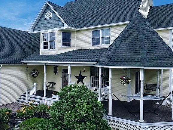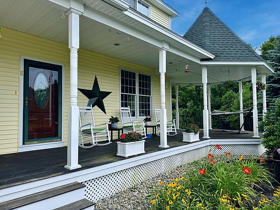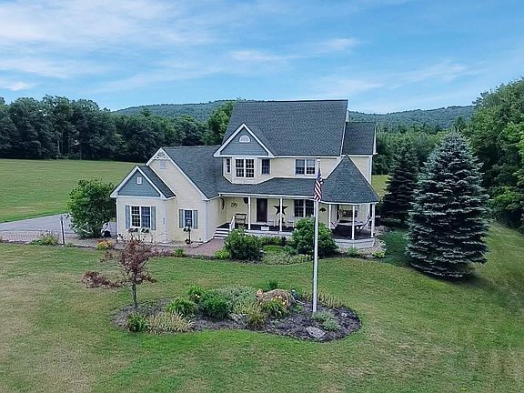 Welcome to this charming Victorian retreat, nestled atop Flanders’s Memorial Road and surrounded by 5.18 acres of picturesque land. This custom-built home, lovingly maintained by its original owner, offers the perfect setting for fall and winter holidays. Enjoy crisp autumn days and snowy winter evenings on the mahogany-wrap-around porch, overlooking open fields and the 227-acre Buxton Forest E. Simons Preserve with hiking and snowmobile trails right at your doorstep. Inside, the formal living room boasts 10-foot ceilings and French doors, ideal for cozy holiday gatherings. The sun-filled eat-in kitchen, featuring custom cabinets and granite countertops, flows seamlessly into a step-down family room with a cathedral ceiling, gas fireplace, and dual glass sliders that open to a 60x25 stone patio—perfect for outdoor entertaining. Warm up around a firepit with a south facing view you'll be in the sunshine in the midst of the winter. Upstairs, the primary suite offers a stone bathroom and walk-in closet, while two additional bedrooms and a full bath complete the layout. The open stairway landing with scenic views, makes a perfect office or reading nook. The property’s expansive fields, apple trees, and wooded trails provide potential for a gentleman’s farm or your own winter wonderland. With first-floor laundry, garage entry, basement access, and a generator hookup, this home blends elegance with modern convenience—a perfect holiday haven!