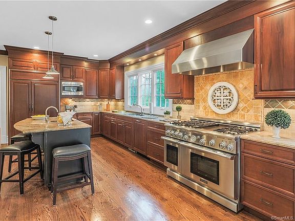 Your Weston Escape is waiting for you! This beautifully appointed Custom Colonial is generously situated at the end of a gracious long driveway far back from convenient Georgetown Rd, making shopping a breeze while being tucked away in your own private oasis. This stunning, sun-filled 5 BR Custom Colonial on 2 level acres boasts a saltwater pool, cabana, and inviting patio and a newly refinished wood deck. Luxury features abound: custom millwork, gourmet mahogany cook's kitchen w/granite countertops & island, Thermador range, Sub-Zero, Bosch DW, walk-in pantry. Over 4668 sq. ft., home offers great floor plan & flow for entertaining. Add'l rooms incl: finished walk-out LL (additional 2,220 sq.ft.) w/flexible living space and optional 1-2 BRs, Bonus/media rm, Walk-up attic with add'tl unfinished 1700 sq. ft. Energy efficient with newly added solar dramatically decreases the annual electric expenses! Minutes to both Weston and Georgetown Centers with award winning Weston Schools. Being ONLY 4 MINUTES TO Cannondale MetroNorth train with rush-hour DIRECT service to Grand Central makes this home ideal for NYC commute.