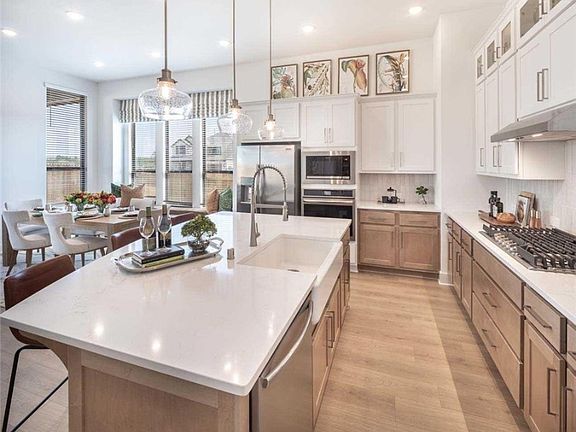 MLS# 504431 - Built by Highland Homes - Ready Now! ~ The Devenport plan, constructed by Highland Homes, presents a stunning living space with exceptional features. With 12-foot ceilings and 8' doors, the home exudes a sense of spaciousness and grandeur. Wood floors extend throughout the common areas, adding warmth and elegance. The kitchen is a chef's dream, featuring built-in stainless steel gas appliances that provide both style and functionality. The Dakota Maple White cabinets offer a sleek and modern look, while the 15” upper cabinets with glass inserts add a touch of sophistication. Quartz countertops complete the ensemble, providing durability and a luxurious appeal. In the primary bathroom, a bay window allows natural light to fill the space, creating a tranquil retreat. An oversized shower adds a touch of luxury and comfort. The living room features a floor-to-ceiling brick gas fireplace, becoming a focal point and adding warmth and charm to the space. The enhanced outdoor living area offers an inviting space to relax and entertain. Smart home features are integrated into the house, providing advanced technology for convenience and control. A tankless water heater ensures an efficient and continuous supply of hot water. Full irrigation and sod contribute to a well-maintained and vibrant landscape. This home offers a perfect blend of style, functionality, and modern conveniences!!