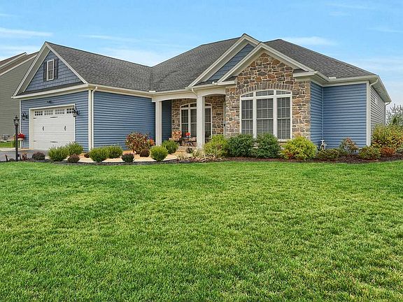 Only three years old, this beautiful 3 bedroom ranch with office is move-in ready! From the welcoming covered front porch, to the open floor plan with dining area overlooking the Great Room, this home is the one you've been waiting for. The Kitchen features hickory cabinets, granite counters, tile backsplash, under cabinet lighting and a breakfast bar. Regardless of the weather, enjoy starting or ending your day in the Sunroom offering beautiful views or relax on the rear deck. A gas fireplace in the Great Room will provide ambience during the winter months. Plenty of custom details from wainscoting, tray ceilings, crown molding and a built in bookcase. The primary bedroom features a double tray ceiling, walk-in closet, bathroom with walk-in shower and double bowl vanity. A full unfinished basement, with Bilco door, a shed that matches the house and a spacious garage provide plenty of storage space. This house is sure to please! Schedule your showing today!
