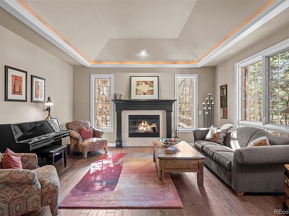 A home that is truly perched above the rest, this regal residence, located on a secluded cul-de-sac in the gated, coveted Village at Castle Pines community, is elevated above the landscape - offering a serene, treehouse-like ambiance. Step inside an elegant foyer where a sweeping staircase and rich hardwood floors set the tone for a home designed with both grandeur and comfort in mind. The living and dining areas exude sophistication, from the tray ceiling with ambient lighting and gas fireplace in the living room to the formal dining room, which features elegant pendant lighting and a useful butler’s pantry. For those who love to entertain, the kitchen showcases granite countertops, premium stainless steel appliances, and spacious bar seating. Adjacent to the kitchen is the great room, where soaring ceilings, a wall of windows, and cozy fireplace with stone surround and custom millwork take center stage. Moving outside to the oversized Trex deck, you'll find yourself in a stunning sanctuary, surrounded by mature Ponderosa pines with filtered mountain views - perfect for entertaining and enjoying nature's beauty. A well-appointed office, spacious laundry room and powder room round out the main level. The upper floor is home to a primary suite that feels like a private retreat, featuring a dual-sided fireplace, spa-like bath with a soaking tub, and a private balcony offering peaceful treetop views. Three additional spacious bedrooms, one en suite, and a full shared bathroom complete the upper level. The finished walk-out lower level is a haven of versatility, featuring a media | rec room with access to the covered patio and a private hot tub with its own dedicated deck, 5th bedroom, a 3/4 bathroom, and abundant storage space. Beyond the home, residents of The Village at Castle Pines enjoy a lifestyle second to none, with access to 3 pools, tennis + pickleball courts, a state-of-the-art fitness center, and 13 miles of picturesque trails - truly the best of the best!