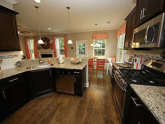 This popular Palmetto Plan offers 5 bedrooms + spacious loft, 3.5 baths, formal dining room, first floor owner's suite and 2 car garage. Other features include Laminate wood flooring in main living areas downstairs. Kitchen is open to breakfast nook and family room and boasts staggered birch cabinets with crown molding and brushed nickel hardware, stainless steel appliances and pendant lights above breakfast bar. Owner's suite has tray ceiling in bedroom and deluxe bath includes soaking tub, glass enclosed cultured marble shower, double bowl cultured marble vanity and elongated toilet. Other features include 2 car garage, 10' x 12' patio, brushed nickel ceiling fans in family, owner's suite and loft, custom paint, plus more!Home is backing to private wooded conservation area.