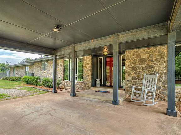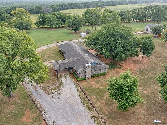 Escape to the tranquility of country living with this charming ranch-style house set on 3 sprawling acres. This property offers a perfect blend of rustic charm and unique amenities, making it an ideal retreat for those seeking peace and privacy. With ample space both indoors and outdoors, enjoy the serene beauty of nature while living in comfort and style. The property is located just minutes south of Norman, making it a fabulous choice for a commuter or anyone who loves the country life but wants those city amenities. Enjoy the gorgeous view of the pond from your huge covered front porch, the perfect spot to sip some sweet tea and breathe that country air. Step inside to the updated entry, where the stone work has been given a fresh and bright white smear finish. To the right is the beautiful living space featuring a welcoming fireplace wall, gorgeous sliding barn doors, tons of window light, and room enough for several different furniture configurations. To the left you step into the dining room, filled with natural light and tons of built-in storage with glass doors for dish display. From there you move into the kitchen. It has a very functional U-shaped layout and even a spot for extra barstool seating. Rounding out the main house are the spacious primary bedroom with ensuite bathroom, two secondary bedrooms, and a lovely shared bathroom. But the tour does not end there, a separate studio space (317 sq. ft. not included in home's sq. footage) is attached to the 2 car garage. It has a reverse cycle AC unit for climate control and an attached bathroom with a dog washing station! Located off to the side of this studio is a fenced dog run, the perfect spot for your pooch! Lastly, you'll be so thankful for the huge storm shelter to take refuge in our Oklahoma storms.