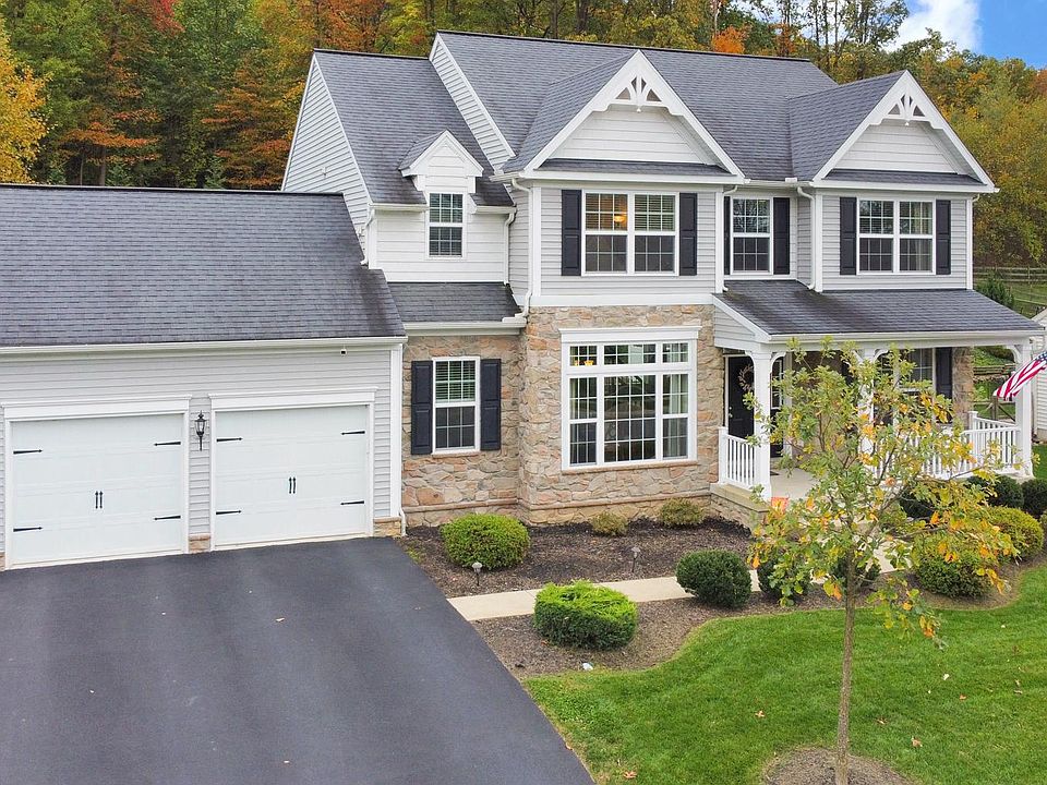 You won’t want to miss this one! Welcome to this wonderful home in the Mountainview Community in Twin Valley School District. From the moment you pull up, the gorgeous curb appeal of this home grabs your attention with its stone front, double roof peaks and farmhouse-style porch. Immediately inside, you’ll notice the openness of this home and the low-maintenance laminate wood-look floors, which run throughout the foyer, dining room and kitchen. The spacious foyer is flanked by a double-door office/study to the right and a formal dining area with a large picture window to the left. Straight through the foyer is the large family room with gas fireplace and 3 large windows overlooking the back yard. The family room is wide-open to the eat-in kitchen, which has gorgeous white cabinetry, sleek granite countertops, tile backsplash, stainless appliances, 5-burner gas stove, large single-bowl under mount sink w/gooseneck faucet, pantry, center island with overhang for additional seating capacity and sliding door to the back yard. The dining room is also accessed from the kitchen, making dinner parties a breeze. Behind the dining room is the laundry room and access to the 2-car garage. Rounding out this level is a coat closet and a freshly painted powder room over by the family room. Upstairs, the primary bedroom is massive, with a walk-in closet and plenty of space for multiple pieces of furniture, including enough space for a sitting area. The en suite bath has a dual sink vanity, walk-in shower and linen closet. Three additional good-sized bedrooms (2 with walk-in closets) and a shared full bath are also upstairs. The huge basement provides plenty of storage, high ceilings and an egress window, so it’s the perfect blank slate for you to finish later if you desire. Outside, enjoy the extremely well-manicured back yard – what was once a totally wooded, rocky, overgrown area was completely overhauled by the current owners and now contains a lush lawn, wonderful landscaping with trees and plants, a maintenance-free composite deck, and a stamped concrete patio which spans the length of the house. The patio is flanked by high vinyl fence walls, so you can relax and enjoy your outdoor space in private. This gorgeous home is just minutes from schools, shopping and major routes, including the PA Turnpike. What more could you want? Welcome Home!