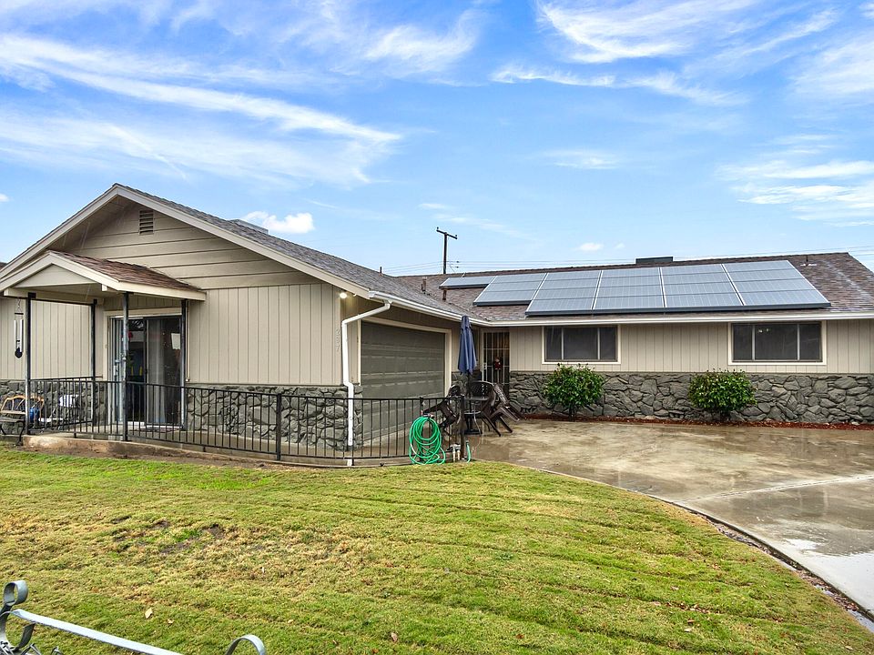 The house features 5 large bedrooms and 3 bathrooms. Three of the bedrooms have private exterior entrances, providing added flexibility. The converted garage includes an additional living room, while a built-in desk and a laundry/storage room add to the home's practicality.