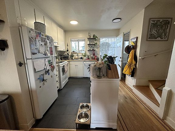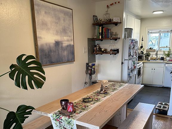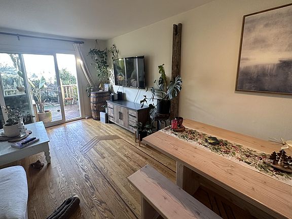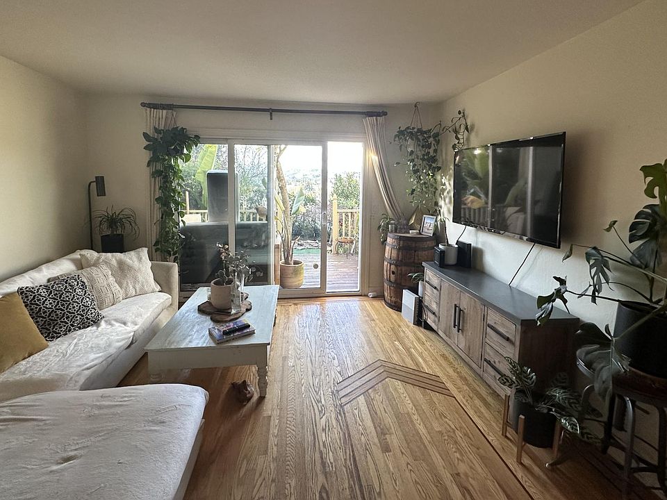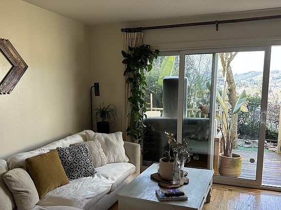 Cozy condo with beautiful valley views, inc. downtown, and a peekaboo view of the bay. Hardwood floors downstairs, plus stairs and landing. Built-in closets and carpet in both bedrooms. Fantastic built-in desk with cupboards and shelves, plus closets painted with whiteboard paint, in the bedroom facing the bay. Washer and dryer in unit.View of trees, hills, valley, and downtown San Rafael from the other bedroom. Quaint backyard (pictured with pavers, but currently is partially fake grass) with around 10 roses, a Japanese Maple, seasonal bulbs, and many other plants and trees. Perfect for someone who loves gardening, but wants it to be of a manageable size. Pet-friendly - must be housebroken and not noisy as walls are shared with the neighboring condos. One assigned parking space close to the condo. Storage above parking space. *Please note in your application if you love gardening and would maintain the garden (so you can get a discount on rent), or whether you do not have a green thumb (in which case a gardener will be hired to come monthly). Owner pays for water and trash. Tenant pays for all other utilities. Access to the shared pool on-site is included in rent. No smoking is allowed. Pets allowed. No pet rent will be charged. Please provide details about your pet when inquiring. Must be house broken and reasonably quiet as walls are shared with neighbors.
