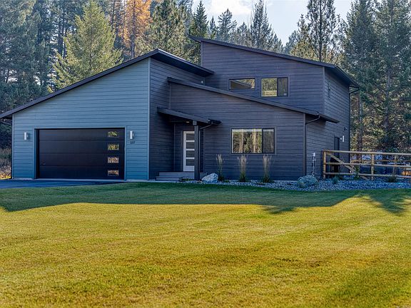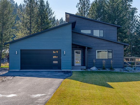This nearly new, quality built, and very lightly lived in mountain modern home sits just outside Columbia Falls, offering a gateway to Montana's adventures. Built in 2023, it features 3 bedrooms, 2.5 bathrooms, and 2259 square feet of open concept living space. The main floor is spacious and bright with vaulted ceilings and a kitchen designed for gathering, complete with a large island and ample storage. Upstairs, a flexible bonus space offers mountains of possibilities. The fenced backyard, of this newly landscaped .58 acre lot, showcases stunning views, underground sprinklers, an extended patio, and a firepit area. Custom blinds throughout and wifi controlled thermostats and garage door opener. Just minutes from Glacier National Park, this home is your better than new basecamp for recreation and relaxation.