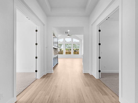 The Michelle | 3 Bed | 2.5 Bath | Study + Game Room | 2.5-Car Garage | 2,575 Sq Ft | 60' lot Meet the Michelle, a stunning one-story farmhouse-style home offering 2,575 square feet of beautifully curated living space, all on a spacious 60' lot. With 3 bedrooms, 2.5 baths, study, and a game room with French doors, this layout is designed to balance open-concept living with purposeful, private spaces. The two secondary bedrooms are located at the front of the home, each featuring walk-in closets and sharing a spacious full bath. A central hallway leads to the heart of the home-a light-filled family room with vaulted ceilings and an electric fireplace, flowing effortlessly into the breakfast area and chef-inspired kitchen. The kitchen showcases a large level 3 quartz island, soft-close cabinetry with gold pulls, built-in GE smart appliances, upgraded glass upper cabinets with puck lighting, and a walk-in pantry. A built-in niche with upper glass cabinets provides a nice space for displaying fine China, a wet bar, and more. Whether you're entertaining or cooking up a weeknight dinner, you'll love the style and function this space provides. The primary suite is a true retreat, featuring dual vanities, a mudset walk-in shower, freestanding soaking tub, linen storage, and a spacious walk-in closet. Other highlights include: Formal dining room perfect for hosting holidays or dinner parties Game room with French doors, ideal for a media room or playroom 2.5-car garage for extra s