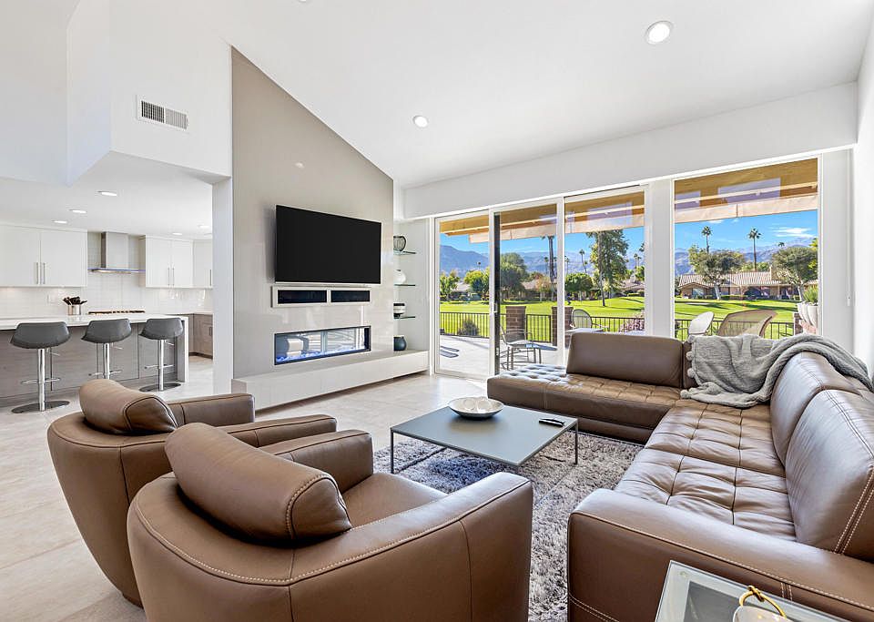 Welcome to this exceptional modern home, where sleek lines, open spaces, and cutting-edge design come together to create a truly unique living experience. Home is being offered furnished including brands such as Brand Jordan, Bo concept, Rapport and Plank and Hide. From the moment you step inside, you'll be captivated by the open-concept floor plan, high-end finishes, and abundant natural light that flows through expansive windows, offering stunning west-facing views of the San Jacinto mountains. This home was stripped to drywall, and just a few of the upgraded features are the new double pane low E glass windows, the 5'' contemporary baseboards, frameless interior doors for a modern look, enclosing the atrium to create an expanded and custom chef's kitchen as well as a walk-in laundry room. Walls were removed for an open concept living space, hallway ceiling was raised by a foot for a more spacious feel and luxurious bathrooms were designed with all new floating cabinets and quartz countertops. Every detail has been meticulously crafted to blend form and function, creating a harmonious space perfect for both entertaining and everyday living. Step outside to your private backyard retreat with Western Mountain views, where a beautifully designed patio, lush landscaping, and ample space for dining and entertaining make it the perfect place to host guests. This home is centrally located in the valley for the best shopping and dining experiences!