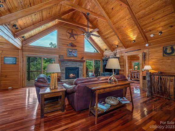 Breathtaking views of the Hickory Nut Gorge & Chimney Rock State Park from this well crafted log home in the heart of Lake Lure. Open floor plan with soaring vaulted ceilings, stone gas fireplace, Brazilian tiger hardwood floors, massive granite kitchen island with seating and custom cherry cabinets. Spacious primary bedroom on the main level with slate shower, two vanities, and large walk-in closet. Sliding glass doors lead to the back deck to where you can grill and enjoy the view under the covered portion perfect for entertaining. The basement features two oversized bedrooms each with a full bathroom. Large rec room with pool table that leads to the concrete patio with even more room to enjoy the outdoors. Add a fire pit to side terrace to create the perfect primary or getaway cabin! Offered Turn Key!