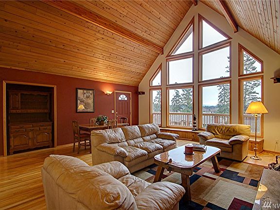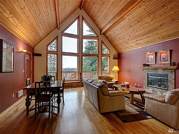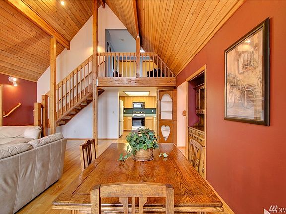 Northwest Contemporary beauty tucked away in a private & tranquil setting of Shelter Bay Community. Open concept living featuring warm natural wood throughout - ceiling, floors, open stairway to loft and master loft/bedroom suite. 2 bedrooms & 3/4 bath on main level. Well-designed kitchen has solid surface counters, tile floor. Wall of windows overlook front deck & small view of water. Large back patio and private back yard perfect for entertaining. Roof approx 5 years old. Cul-d-sac.