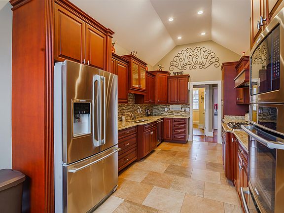 - RoomKitchenFeatures: Granite Counters, Recessed Lighting, Cabinets-Stained, Floors-Tile