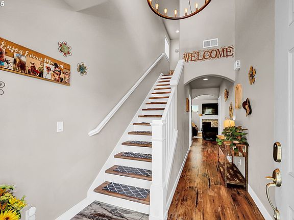 Step inside this custom Junction City home and you will be impressed with the grand chandelier entryway! The spacious living room offers a cozy gas fireplace, built in desk and an open concept flowing effortlessly into the kitchen! The eating bar creates the perfect place to entertain guests while showing off the quartz counter tops, induction cooktop and stainless steel appliances. Upstairs, retreat to the primary suite complete with LVP floors, recessed lighting, backyard views and an ensuite bathroom! The primary bathroom offers dual sinks, barn door and a large walk in closet! The two other well appointed bedrooms are located upstairs and share a "Jack and Jill Bathroom". Also conveniently located on the second floor is the laundry room with washer and dryer included! Step outside and enjoy the fenced and landscaped backyard There is a covered patio with recessed lighting and custom raised beds with trellis for extra privacy! Located in Junction City's most sought after subdivision! This friendly neighborhood is close to parks, shopping and local schools.