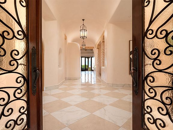 Grand Hacienda Winner and the unrivaled Belle of Tano Road redefines the essence of luxury living. Nestled behind exquisite handcrafted wrought iron gates, you are transported to a serene desert oasis, embraced by the splendor of nature, offering unparalleled privacy and sanctuary from the world. As you enter through handcrafted mahogany and wrought iron doors, the soaring ceilings and diamond plaster walls create an atmosphere of grandeur, while the Italian porcelain floors reflect a commitment to the highest standards of luxury and craftsmanship. Every detail has been meticulously curated for you. The great room, with its endless windows, invites you to bask in the breathtaking views of the sweeping mountains and the enchanting cityscape below, perfectly positioned above the exclusive enclave of Santa Fe. The sprawling estate houses two exquisite primary suites, each featuring spa-like bathrooms with soaking tubs, emperor showers, and ample space to have a powder room lounge, a meditation space, or a fitness area. Each of the four bedrooms is its own sanctuary, complete with fireplace and en-suite facilities, ensuring every guest feels like royalty and that their comfort and privacy are paramount. The gourmet kitchen is a culinary dream featuring custom cabinetry, Wolf range with double ovens and a warming drawer, Sub-Zero refrigerator, and a massive island seamlessly connecting to the outdoor cooking and dining spaces for effortless entertaining. Expansive grounds, nearly three lush acres, adorned with manicured lawns, vibrant rose gardens, and fruit trees, offer an idyllic setting for outdoor gatherings. These luxurious spaces provide not just comfort, but a lifestyle of sophistication. Immaculately maintained and thoughtfully expanded, this sprawling 6,700sq.ft estate is a testament to refined living. This is more than just a home - it is a lifestyle drenched in luxury and elegance. Design that speaks to the most discerning tastes and coveted desires. *Video*