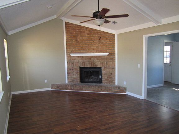Freshly painted exterior and interior; cathedral ceiling and brick fireplace in living room; generous laundry room; kitchen cabinets have been resurfaced; updated light fixtures and bathroom vanities; ceramic tile bathrooms and surrounding showers; laminate wood floors in living room, and newly carpeted bedrooms. Upon receiving approved contract, seller will provide refrigerator and oven to coordinate with microwave and dishwasher already there.