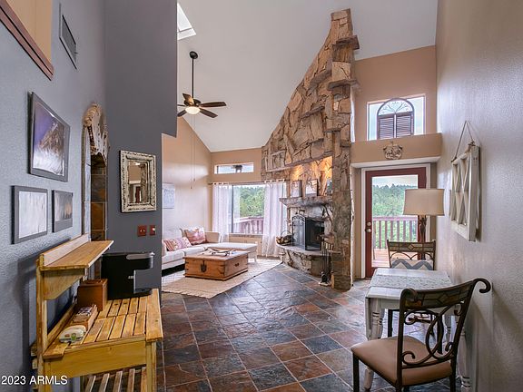 cool Flagstaff evenings. Gather around this masterpiece with family, creating memories that will last a lifetime. The heart of the home lies in the phenomenal kitchen, featuring custom stone counters. The thoughtfully designed layout places the master bedroom with full bath on the entire second floor, ensuring privacy and tranquility. Wake up to breathtaking views of the surrounding natural beauty. The downstairs offers a 2nd master bedroom with a full bath and slider door leading out to a private yard.
