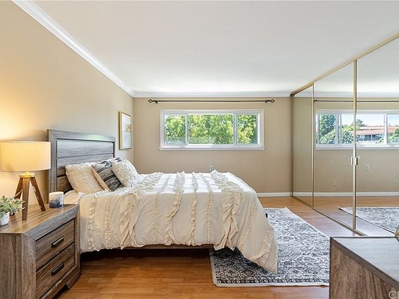 This impeccable home is situated on a very private corner location in the prestigious guard gated community of Laguna Woods. The impressive double door entry invites to a beautiful granite floor foyer. Enjoy entertaining in the fully equipped light, bright kitchen that features quality appliances, granite countertops, & a relaxing view to the courtyard. French Doors lead to spacious & sunny balcony with views of the neighborhood, & lovely trees, perfect for catching the morning sun or evening stars. The generously sized, luxurious master bedroom includes an en suite spacious bathroom with granite countertops, relaxing tub with shower, & generous closet space. Guests will appreciate their own large bedroom & updated bathroom shower wand, & gorgeous granite countertop. All windows are energy efficient dual panes, with warm wood like laminate flooring throughout, beautiful Crown moulding, designer tile in the bathrooms, & two toned designer paint. This building has an elevator & the safety of being located on an upper level with the convenience of no stairs and subterranean parking with storage. Located within this building, it has its own recreation room with billiards, card/game tables, great for entertaining & meeting new people. This is a turn key property ready to move in & enjoy! Walking distance to club house 4! Take advantage of all the amenities Laguna Woods offers including golf, tennis, lawn bowling, pickleball, swimming, horse stables, and clubs to name a few.