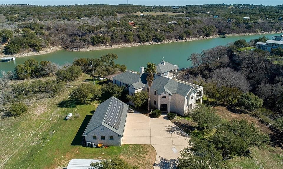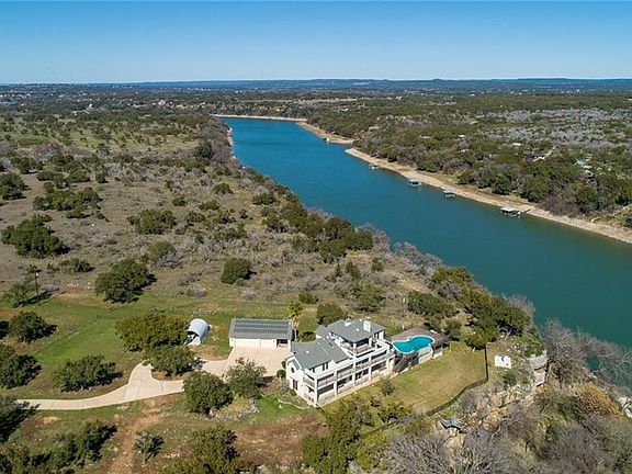 Amazing gated waterfront property on over 7 acres with boat dock, horse barn and panoramic views of the water and hill country. Enter into this totally fenced private oasis with long drive way leading to custom home. Breathtaking views from all rooms, soaring ceilings, walls of windows, wood and tile floors. Lovely study with wall of built in bookshelves, kitchen open to family room, full bedroom/bath down great for guests, 500 bottle wine fridge in climate controlled room. Beautiful property surrounded by trees, hiking paths, cliffs and nature. Perfect for the discriminating buyer who wants it all.