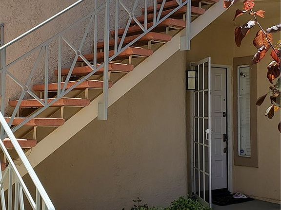 You're going to love this! Beautiful, upstairs unit with high vaulted ceilings. Light and bright. Popular Santa Fe complex! This condo features two primary suites each with it's own bath. Both bedrooms have walk-in closet. Large living room with fireplace and direct access to balcony. Recently installed plush carpeting. Beautiful white kitchen cabinetes with upgraded counter tops, stainless steel appliances. The kitchen overlooks the living room with nice views and mature trees. Primary bathroom/tub has been upgraded with larger tub and tiled walls. Indoor laundry including stackable washer and dryer is an added convenience. Added bonus with detached 2 (two) single garages. Association amenities include pools and spas to enjoy! Ideal location; close to parks, paseos, restaurants, shopping mall. Easy freeway access.