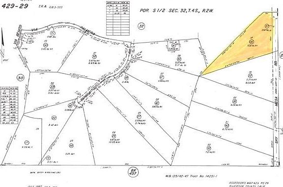 FIVE (5.02) ACRES in "THE RANCH at SKY MESA", a prestigious, private gated, HOA community high in the hills above the Menifee valley. Lot 18, tract 1. 460' frontage. Pad plotted on site map. Corners marked. District water. Utilities in paved street. Propane & septic tank area. Elevation of 2500'+-. Natural terrain. High-tech security recording systems at front & back gates. Buzz in guests. Four horses allowed. Minimum 2800 sq ft + homes w/ 3 + car garages. 77 parcels total in the community w/ 5 + acres. No mobile homes. Private yet close to services & commute to Ramona Expressway, Hwy 74 & realigned Hwy 79, I-215, I-15 & the 60 & 10 Fwys. 1 of 13 lots also available as a package. Builder/developer investment build or hold. OWNER MAY CARRY! Call for viewing to this prestigious gated, secure HOA community!
