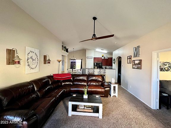 Upon entry, the interior impresses with vaulted ceilings. The kitchen is outfitted with black appliances and a pantry, and it opens to the adjacent dining area. Pass through the living room to the sliding glass doors leading to the covered patio and backyard, or the double doors leading to the den. The Master suite boasts a walk-in closet and an ensuite bath with a garden tub and shower combination. 9.2KW solar panels mean little to no aps bill. Available 6/1/2023.