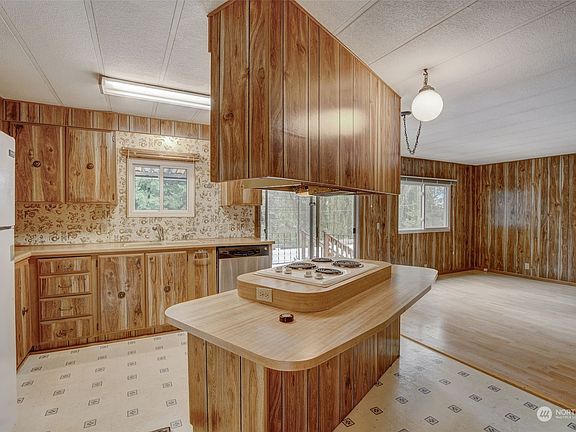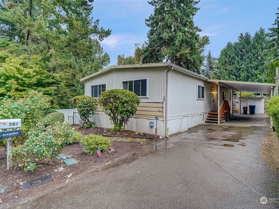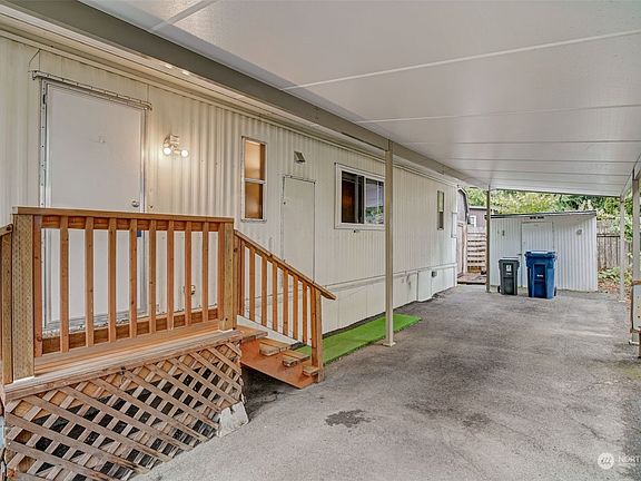 This great home is situated in a prime space within the community. It's situated on a corner lot, and has parking for two cars with a covered porch. This is a two bed and two bath home. Nice clean interior, open concept living, dining and kitchen. The home has large living and dining areas, ample storage, a double oven, with stovetop in the center island and newer appliances. Wood paneling throughout the home. The primary bedroom is large and has double closets and a bathroom with a newly remodeled shower stall. The second bedroom' shares access to the hallway bathroom. Private backyard with one large and one small storage shed. The roof is only four years old.