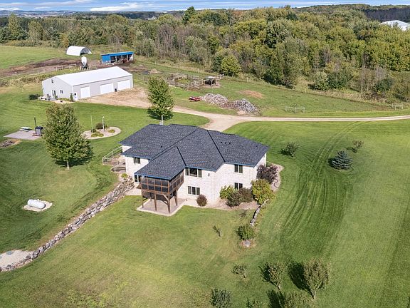 This impressive 5-bedroom, 4-bath executive rambler sits on almost 20 acres of privacy and freedom just an hour from the Twin Cities. Rarely do properties combine so many sought-after features: solar panels, dual heating (propane + wood stove), 3 pastures readily fenced with electric fence, a swimmable pond, a massive 72x41 pole building with a "man cave", 40x16 animal shelter, 20x30 hoop barn and more.