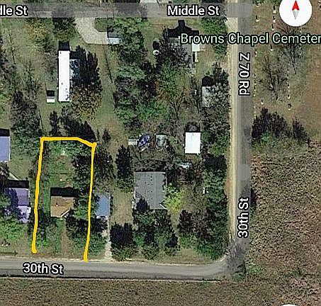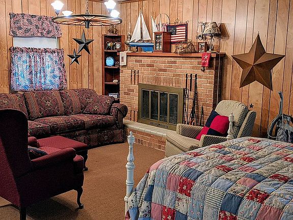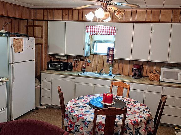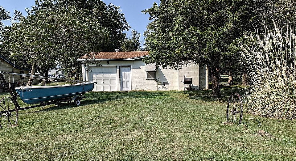 Studio style cabin with 504 sq feet of space. Driveway is flanked with old metal wagon wheels. Large brick wood fireplace and vintage wagon wheel hanging light gives this cabin a cozy cottage feel. Kitchen includes full size refrigerator, electric stove and a wall of kitchen cabinets. There is a bathroom with shower stall. Window AC unit. Small storage shed on back of property. Attached garage offers an additional 312 sq feet of living space with a wall of windows, electric garage door opener and full screen insert to enjoy the quiet and wildlife in the large field the cabin faces without being bothered by bugs. Water comes from group well and has a $50 fee per year for maintenance and owner doesn't have to do anything else. Septic tank buried on property. Propane tank on property, currently not in use. Electric is provided by Evergy.