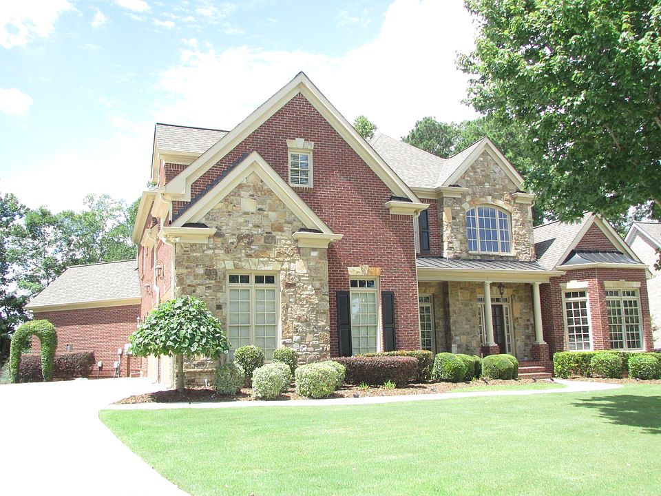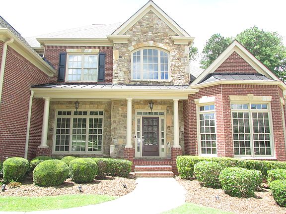 Grand entrance! Three-sided brick and stone home with front porch. Stunning two-story foyer with spiral staircase leads to a sun-filled two-story great room with coffered ceiling, fireplace, built-ins. Gorgeous hardwood floors, upgraded trim package, fresh paint throughout. Library/Study with custom-stained French doors, chair rail, trim, and ceiling beams, perfect for home office or quiet study space. Spacious formal dining room with butler's pantry. Gourmet kitchen features granite countertops, stained cabinets, stainless appliances, double ovens, island, breakfast bar, walk-in pantry overlooking fireside keeping room. Serene master suite on main with sitting room and deck access. Master bath with jetted tub, double vanity, separate shower and walk-in closet. Upper level includes four large secondary bedrooms, two with en-suite baths and two connected by a Jack & Jill bath. Wide catwalk with iron rails overlooks the great room. Full unfinished daylight basement stubbed for bath offers plenty of room to expand and customize. Private, level backyard is ready for pool and outdoor living. Sought after Hedgerows community is convenient I-85 & I-985, Shopping, Restaurants, Lake Lanier, Chateau Élan and more!