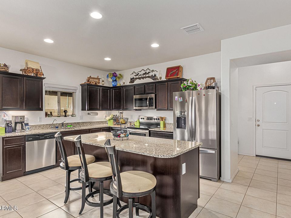Highly upgraded home in the attractive Buckeye community of Sonoran Vista. 4 bedrooms, 2 bathrooms, with a sought after great room open concept floorplan. Tile floors in all the main areas and carpet in the bedrooms. Kitchen comes with granite countertops, stainless appliances, large island, and upgraded cabinets with crown molding. Master bedroom has a large walk-in closet, double sinks, step-in shower, and private toilet room. The 3 other bedrooms are generously sized and all have a dedicated closet. Premium lot with open park behind and no two-story homes on each side. Front and backyards recently rejuvenated with new landscaping, fresh fruit trees, and attractive paver work. Absolutely move-in ready!