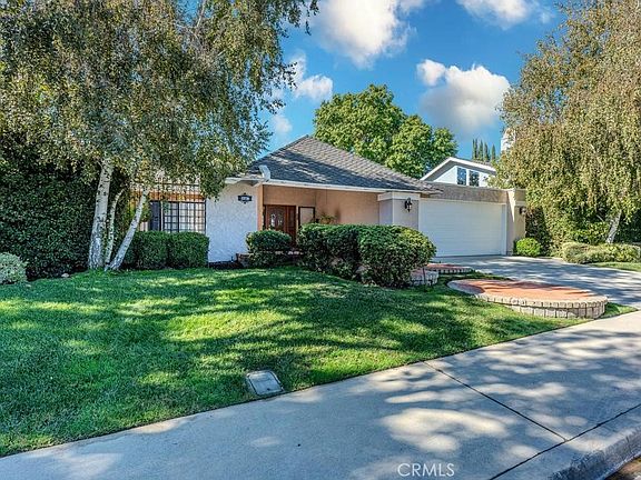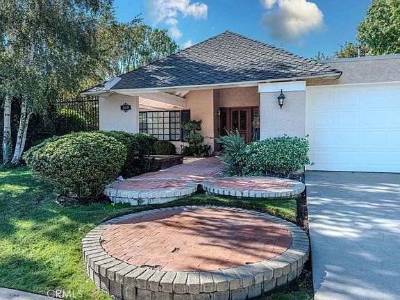 Sharp, move-in condition single story in Valencia Hills! Terrific location away from traffic with a low maintenance private yard featuring mature trees, large patio fully covered and the shed and BBQ stay. Inside features soaring ceilings and a completely open floorplan with large living space both in the living room and the family room off the kitchen. The primary bedroom is spaciouse with a walk-in closet. This is the largest single story in the area and the space is thoughtfully designed. The kitchen impresses with light cream-colored cabinets, recessed lighting (the old box lighting is gone!), crown molding, granite counters and stainless appliances. Both bathrooms have also been redone - shower, newer vanities, lighting and granite counters. Wood floors throughout the living areas have been well maintained and speak to the care that these long-time owners have put into the property. Other improvements include the shutters and newer HVAC system which is now in the attic area with an enormous amount of storage accessible from the pull-down ladder. The Valencia Hills neighborhood is loved for its open floorplans, paseo walking trails, highly rated schools and close proximity to shopping, dining, Town Center and the freeway. The amazing HOA features remodeled clubhouse, junior Olympic sized pool, new tennis/pickleball courts, tot lot and more. All of this for one of the lowest HOA fees in Valencia and no Mello Roos taxes. Come home to this single-story beauty in Valencia Hills!