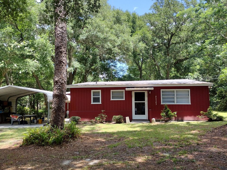 Secluded cottage situated on a beautiful wooded almost 1 acre corner lot adjacent to the Ocala National Forest. Large pine trees and lush plants. Ideal small home or second getaway in the heart of the Ocala National Forest, Near the Marinas, Lakes, Springs, Boating, Hunting, Fishing, etc. 2 Bedrooms, 2 Bath, 1000 Sq ft. living area with central air and wood floors. Washer, dryer, refrigerator included. Covered 2 car carport, 16 x 10 storage building with lockable double doors, metal roof. Well with pump house. Septic system. This home is in an estate and needs some TLC and is priced accordingly. Cash only offers.