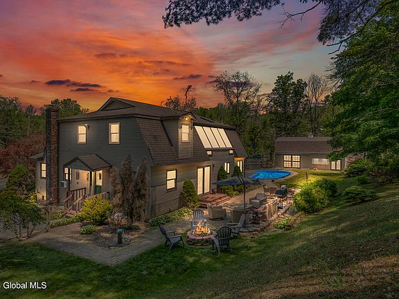 One of a kind Greene County getaway! Plenty of space to entertain or relax in this unique contemporary. Beautiful granite countertops and cherry wood cabinets in the kitchen. The large dining room, vaulted ceiling in the living room and first floor guest room optimize the space. Private rear sunroom off the primary bedroom with balcony overlooking the yard and pool. Amazing closet space throughout, including a large walk-in closet in the primary bedroom. Spread out with the full basement bonus areas including a pool table, family room and fitness space. Enjoy the Hudson Valley evenings under the stars in the inviting outdoor space with in-ground pool (new equipment). Large barn with stamped concrete floors and display doors. Easy commute to NYC or Capital District