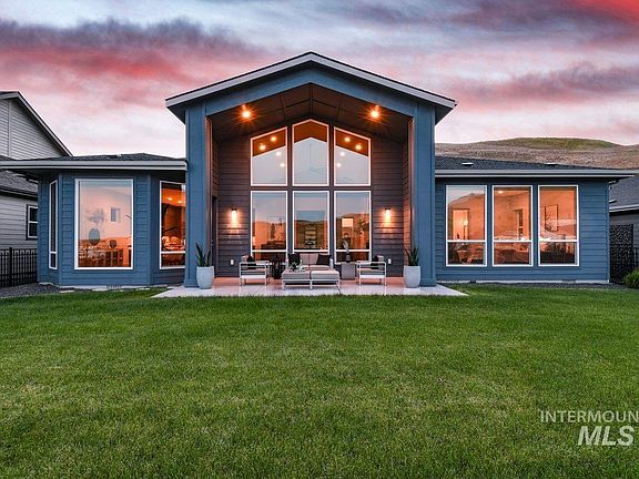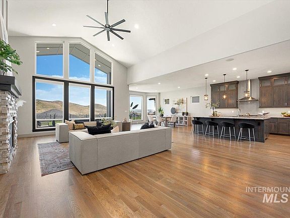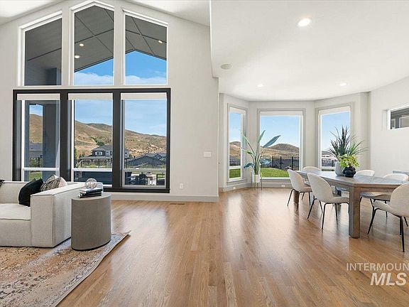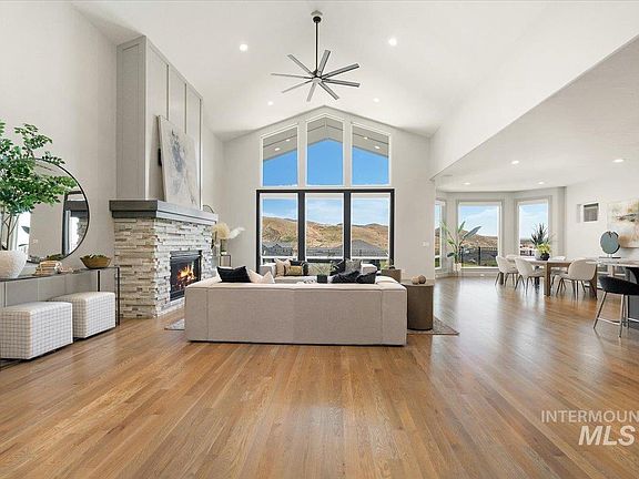 Nestled against the rolling Boise foothills, this modern masterpiece offers mesmerizing views creating the ideal backdrop for entertaining & relaxing in style. Magazine worthy great room accented by dramatic walls of tinted windows & soaring 20' ceilings highlight the panoramic scenery from many vantage points effortlessly blending indoor & outdoor living. Stunning chef's kitchen boasts custom soft-close Euro cabinetry, double oven, gas stove & expansive island overlooking the striking stone fireplace. Open concept living/dining area creates seamless flow ideal for hosting family & friends. Relax & unwind in the breathtaking master ensuite reminiscent of a luxurious day spa featuring a lavish soaker tub, tiled walk-in shower & dream closet! Spacious 3 car garage complete w/epoxy flooring & electric charging outlet is the perfect place for storing all your recreational toys! Just steps from trailheads & the community pool or explore the Greenbelt, float the river & boat at Lucky Peak - all minutes away!