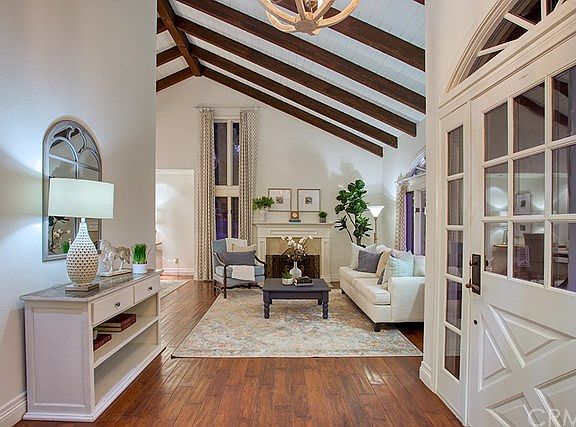 Located on a single loaded street, this custom Village home has captivating curb appeal with beautiful stacked stone feature wall, iron baluster staircase & delightful color changing fountain. As you enter through the farmhouse front door you are welcomed by high wood beamed ceilings & large windows that fill the front living room with natural light. Kitchen is fit for a chef, complete with stainless steel appliances, center island, built-in stove cooktop, double oven, granite counter tops & ample cabinetry space. Kitchen opens to family room with a handsome flagstone fireplace & large built-in entertainment center. The master suite is situated on the main level with high ceilings & sizable private balcony overlooking serene open space. Master bath features his and hers sink, separate bath & shower & walk-in closet. Main level secondary bedroom with balcony can be used as an office. Upstairs boasts a custom built-in workspace and three spacious secondary bedrooms with tranquil views from each room. Gorgeous dual french doors lead you to the expansive gated backyard with extraordinary views of Saddleback Mountain, mature landscaping, fruit trees & enclosed dog run with artificial turf. Enjoy daily alfresco dining & bird watching under a magnificent pergola with no neighbors behind you. Additional upgrades include custom chandeliers, hand scraped wood flooring, dentil crown molding & upgraded three-car garage doors with iron detailing. This home truly has an abundance to offer!