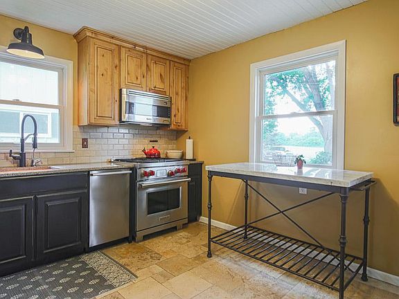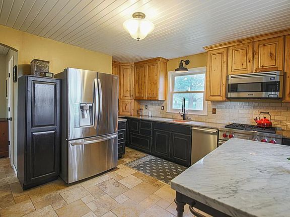 40 acres! 4 bedroom, 2 bath home features hardwood & tile floors throughout, kitchen with high-end stainless steel appliances, copper sink, tile backsplash, quartz tops, bead board ceiling & knotty alder cabinetry. Steel roof, all newer windows, newer furnace & air, 24x12 deck & 3 outbuildings including 62x30 garage with cement floors & power, 56x24 barn & a 60x32 shop. Fenced for animals, mature trees, tillable & pasture land its all here, even natural gas.