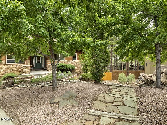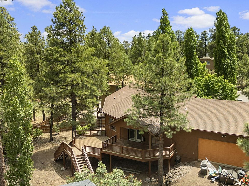 This newly refreshed 3 bed, 2.5 bath custom home greets you with ample light and vaulted ceilings! Not only is this lot on almost HALF AN ACRE, but it sits at the back of the cul-de-sac, offering privacy and plenty of room for activities. The exterior features include a drive-through 2 car garage (garage door on both sides), a freshly painted multi-level deck and primary balcony, a plentiful mix of trees and a proper tree house! The interior boasts fresh paint on the main floor, 3 year old furnace w/ central AC, oak hardwood floors, and a massive walk-out basement with a half bath. All three bedrooms are located on the main floor... with 3 steps up from the front door. Utilize the open concept kitchen, dining, and living rooms to entertain or simply make daily routines easier for the family. Take advantage of the quick 8 minute drive to downtown, 5 minute drive to NAU, 5 minute drive to lots of stores and restaurants, and few minute walk to the Tot-lot style playground off of West Fresh Aire Street.