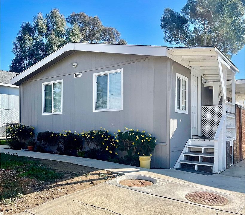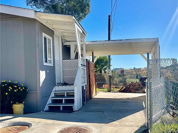 Amazing opportunity to be a homeowner with this beautiful remodeled 2 bedroom 1 bath manufactured home on a permanent foundation located on the border of Canyon Lake and Menifee! Enter into the spacious living room with an eye catching cathedral ceiling and plenty of natural light! The kitchen is nice and open and boasts Mocha Wood Cabinets, Granite Countertops, built-in Microwave, Electric Stove, and plenty of storage space for all of your cooking needs! Both bedrooms are a healthy size and are right next to the impressive bathroom with a white vanity and a highly desired step in shower! Newer Drywall and texture, roof, recess lighting, moldings, doors , double paned windows and laminated flooring throughout. The backyard has a matching shed, and is a blank canvas with endless possibilities and stunning views of the mountains. Covered carport and a gate surrounding your property for extra security. Very clean property and ready to move in-must see to appreciate!