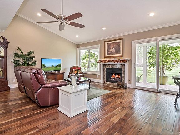 This turn-key, CUSTOM UPDATED Rosa Model, located at the end of a cul-de-sac with a greenbelt on 3 sides, exudes pride of ownership! The many features of this home include: Custom Dutch Door entry; solid wood walnut flooring; Win-Dor dual pane, etched glass windows and sliders; vaulted ceilings; crown moulding; wide baseboard's; recessed LED lighting; 2 patios; a direct entry 2 car garage with custom decorative floor, custom storage cabinets, & pull down aluminum stair attic access; new plumbing & a full house water filtration system. The master suite features double entry French Doors, en-suite bathroom with dual vanity, custom designed "rainfall" shower; walk-in closet with custom cabinetry; bay window and ceiling fan. The open concept living area boasts a kitchen with granite counters, custom cabinets, beautiful appliances, reverse osmosis water system and skylight. A custom granite dining island has seating for 10 and bunches of storage & overlooks the living room with its cozy granite surrounded fireplace. The office (3rd Bedroom) features custom built Cherry wood cabinets and 2 desks. The secondary bedroom has more custom built cabinetry and ceiling fan. The 2nd bath has a glass enclosed shower, pedestal sink and skylight. The rear patio has an Alum-A-Wood patio cover with recessed LED lighting, patio heater and ceiling fan. The 2nd patio, has a remote controlled, retractable awning. This home is not going to last long!