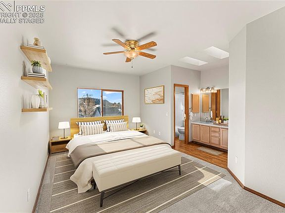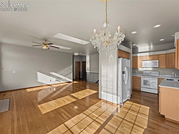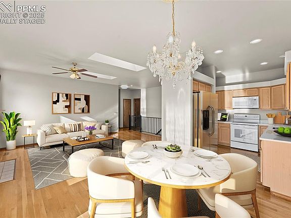 Welcome to this beautifully updated walk-out rancher in the highly sought-after Campus Commons neighborhood—perfectly positioned at the foothills of Austin Bluffs Pkwy and minutes from Palmer Park, UCCS, shopping, dining, and endless biking/hiking trails. This home blends comfort, convenience, and Colorado lifestyle in one stunning package. Step inside to soaring 9-foot ceilings, abundant natural light, and a warm, open layout designed for everyday living and effortless entertaining. The main level features rich hardwood floors throughout (bedrooms excluded), adding both character and durability. A private main-level study with elegant French doors creates the perfect work-from-home space or quiet reading nook. The living room is bright and welcoming, enhanced by skylights, large windows, and ceiling fans for year-round comfort. The charming oak trim package adds a timeless, craftsman feel. The adjoining kitchen offers generous cabinet storage, smooth countertop space, and an easy flow into the dining and living areas—ideal for hosting or casual family meals. The spacious primary bedroom provides a peaceful retreat, and the secondary bedrooms are perfectly sized for guests, kids, hobbies, or multi-use flexibility. The walk-out lower level expands your living space dramatically—great for a rec room, home theater, gym, or anything your lifestyle calls for. Enjoy Colorado’s four beautiful seasons from the private backyard, complete with mature landscaping and room to create your dream outdoor space. The walk-out design makes indoor/outdoor living seamless. Additional highlights include: ample storage, thoughtful layout, newer mechanicals (if applicable—add details), and an unbeatable location in an established, quiet neighborhood known for its accessibility and outdoor access. This home offers the perfect balance of style, function, and Colorado charm—ready for its next chapter and your next adventure. Welcome home!