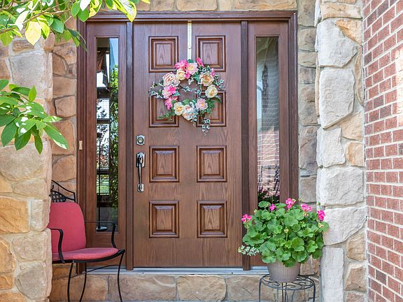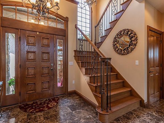 This custom-built executive home is loaded with character, beauty, and highest quality upgrades! The impressive architectural design, the tasteful stone and brick exterior, and the beautiful landscaping all come together to create a stunning presentation. Entering the front door you'll be warmly welcomed into a large foyer with arched windows, double chandeliers, and views of an open stairway with wrought iron balusters, a custom curved balcony/overlook, and a spectacular two story great room. The great room offers an impressive stone fireplace wall surrounded by floor to ceiling windows, Brazilian Cumaru hardwood flooring and extra wide crown molding and baseboard trim. The open concept layout leads you into a magnificent kitchen that will take your breath away! A gorgeous 9 foot x 5 foot center island with granite top is surrounded by maple cabinetry.