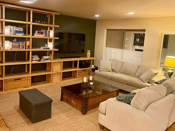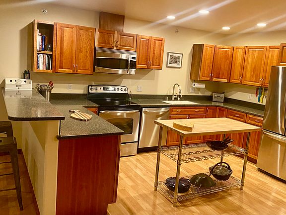 ALL UTILITIES INCLUDED, including wifi, two on-site parking spots and in-floor heat. This large, 1400 Square foot, fully furnished two-bedroom/1 bath condo includes a sunroom and is located in a cull-de-sac close to the airport. The comfortable living room features Bassett furniture with feather filled back pillows, a flat screen tv, and a large modern bookshelf.