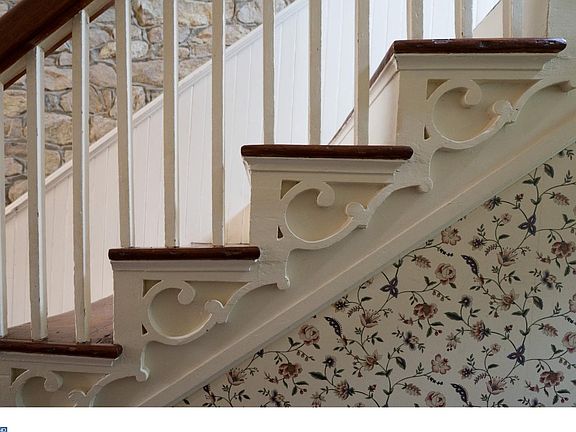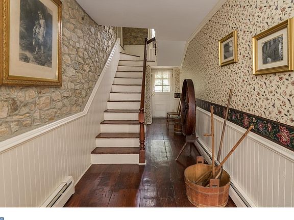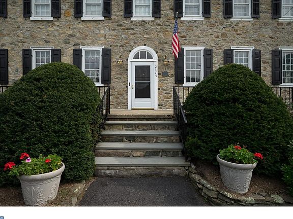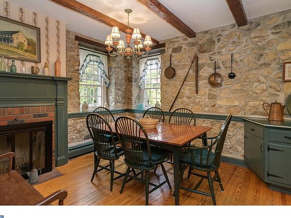 This stone and slate 2-story antique home with 4 bedrooms and 2.1 baths, nestled in picturesque rural lands just north of Riegelsville, sits on an acre of ground. Historic hallmarks of the home include original molding, exposed wood beams, deep set windows, wrought iron hardware and 5 fireplaces. A wide front porch spans the front entrance while secluded patios stretch from the rear of the house. In the entrance foyer the center stair is flanked by a wide plank pumpkin pine floor and exposed stone walls. Unlike typical historic homes the floor plans here offer flexibility. The existing first floor includes an eat-in kitchen, den, living room and in-law suite with a second kitchen. On this floor, with the elimination of the in-law suite, space could be available for a master suite or a large dining room and a great room. The attic, with a finished room, offers space for a playroom or additional storage. The partial basement, with root cellar below, would make a spacious wine cellar. Lovely stone, brick and wooden outbuildings provide character as well as functional space for storage, a planting shed and a garage with unfinished second floor. The grounds, with colorful landscaping, provide a background for an event as special as a wedding. This property has an interesting beginning as a farm house in the late 1700's, later transforming into a popular hotel on the well-traveled Stage Coach route originating in Philadelphia, before resuming its current identity as a residence. Close proximity to shopping, entertainment, river recreation and main road arteries of I-78 and Route 611.