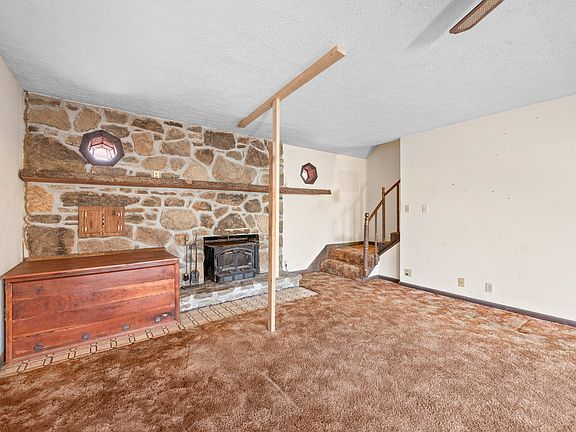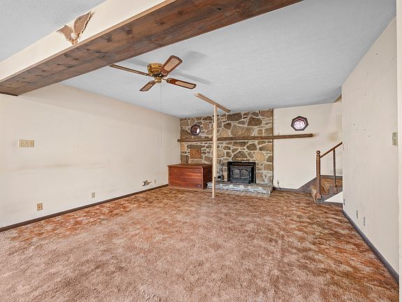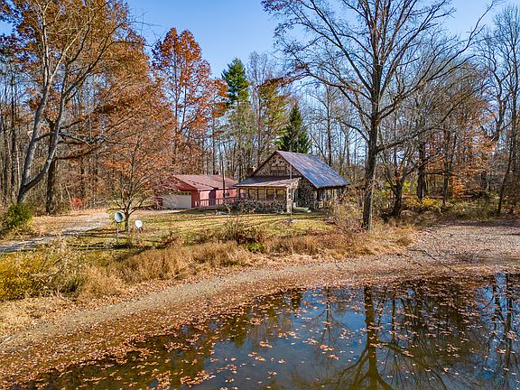 This serene, stone home is situated on 9.88 acres with a 1 acre pond! Home offers 3 bed, 2 bath with plenty of privacy and seclusion. Open Living room renders a cozy, wood burning fire place. Plenty of storage in kitchen and throughout home. A 36x24, 2 car det- garage with work shop, heat, and 200 amp. A, 52x52 pole barn with separate electric and another 32x30 metal shed. Home and det gar has a newer metal roof that has a lifetime warranty.