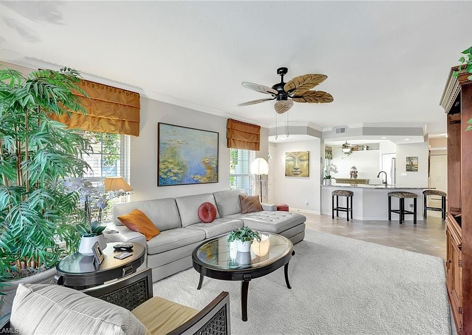 1st Floor and End Unit! Welcome to this well maintained 3 Bedroom 2 Bath coach home with 1,548 square feet under air living space and 1 car detached garage! This home welcomes you and your guests with an open floor plan, a light and airy atmosphere, Professional window treatments (2023), 2" blinds throughout condo(2020), 7 updated ceiling fans throughout (2019), 18in large tile on the diagonal and finished with beautiful crown molding perfect for Florida living. The open kitchen is impressive with many upgrades including an expanded granite countertop and oversized sink (2021), a stunning Designer tile backsplash (2023), Energy- efficient stainless steel appliances (2019) and white cabinetry with roll-out bottom shelves. The primary bedroom is spacious with access to the screened lanai, walk-in closet and ensuite with raised vanity, dual sinks with updated hardware, comfort tall toilet with soft closing lid (2022) and walk-in shower. There are 2 additional bedrooms and an additional bathroom also upgraded with raised vanity, tall toilet with soft close lid and upgraded hardware. And laundry with newer large capacity washer (2024) and dryer (2019). Sit and relax with your morning coffee, a good book or wind down after a long day on your screened in lanai listening to the calming sound of the water fountain and lake. Stone-coated steel roofs were added community-wide in 2020 for peace of mind and durability. You will appreciate the Resort Style Living at Lighthouse Bay: This gated community is packed with amenities, including:5 pools, including a lap pool 2.5miles of walking/jogging paths A robust bocce program Tennis courts with a pro on staff 2 boat houses, a fitness center, sauna, clubhouse, and library Arts & Learning Center and more! As a bonus, a Bronze Membership to the Brooks Commons Club is included, granting access to a private restaurant, enrichment center, pickleball, vibrant social programs, and more. Prime Location. Enjoy being just minutes from Coconut Point Mall, dining, entertainment, SWFL International Airport, and pristine beaches. This is your opportunity to live the Southwest Florida lifestyle in style and comfort—schedule your private showing today!